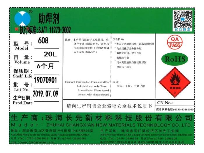 产品特性:608水溶性助焊剂选用特殊活性剂体系,焊后殘留低,腐蚀性低,易漂洗。