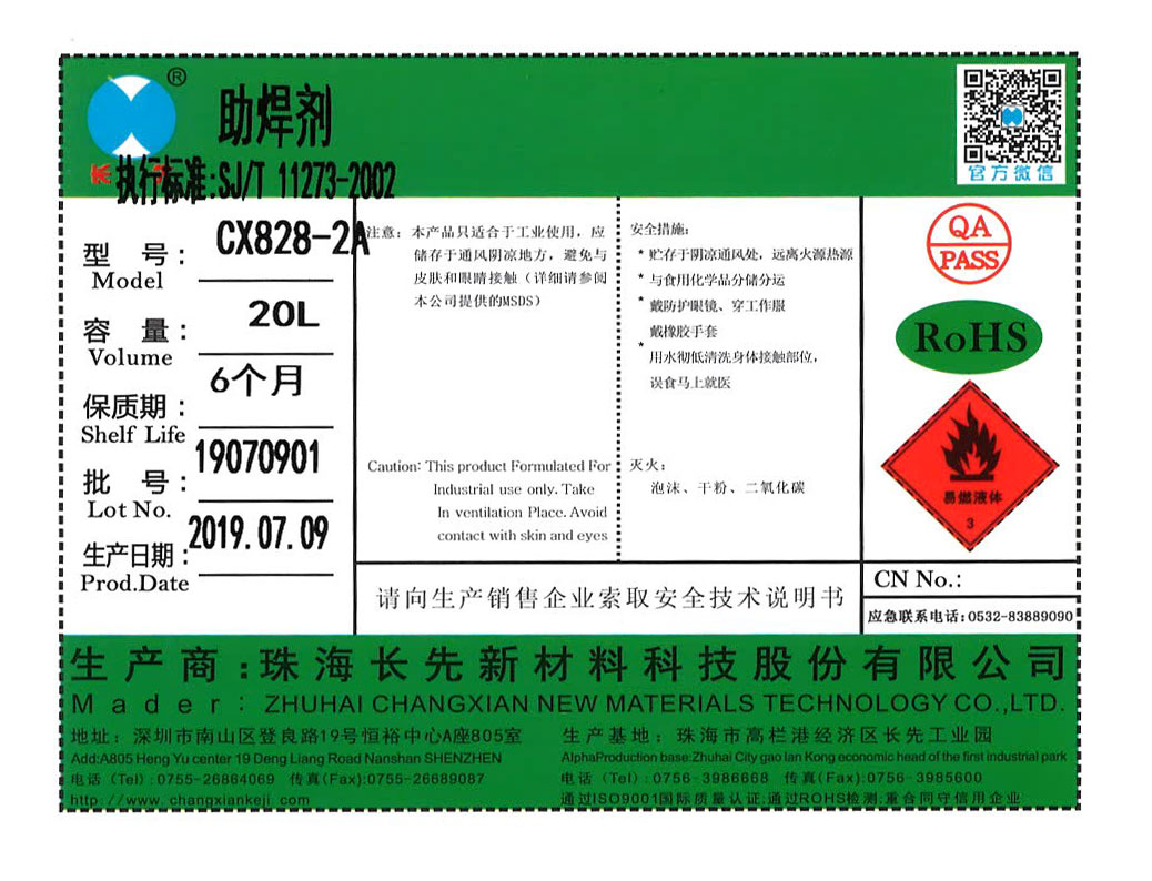 CX828-2A助焊剂是一款免洗助助剂,这款助焊剂活性体系经过特别设计,焊接能力强,对一些难焊电路亦可得到良好的焊接效果, 另一个特征是高湿润性,扩展性好。符合ROHS、无卤、REACH等环保要求