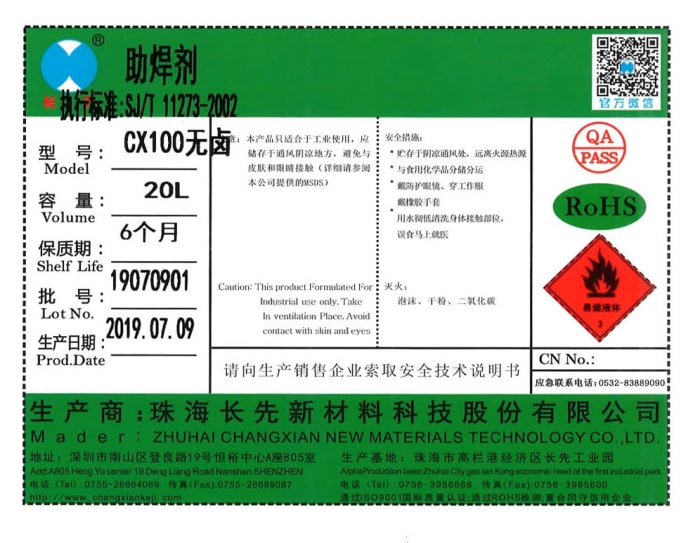 产品特性:本剂不含卤素,焊后电绝缘性好、耐恒温恒湿性能优越,耐高压,焊前焊后能保持长期稳定。