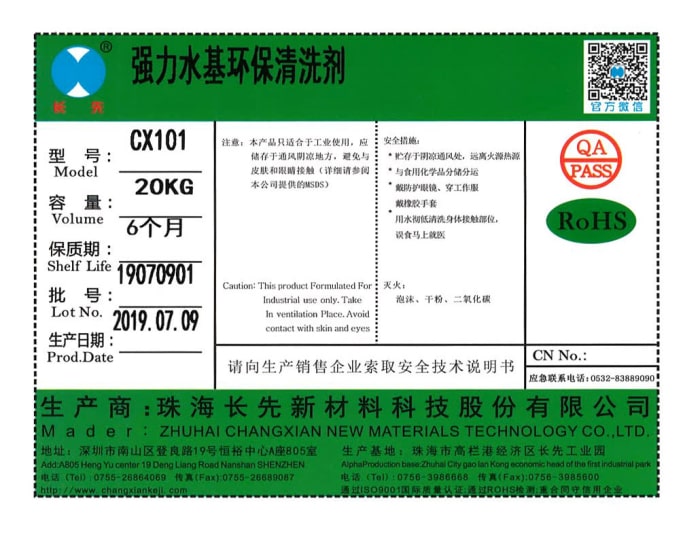 CX101强力水基环保清洗剂含有强力乳化渗透剂、表面活性剂,对金属表面脏物清洗效果极好,专门用于锂电池外壳表面油脂、碳迹、电解液等脏物的清洗及放电处理。